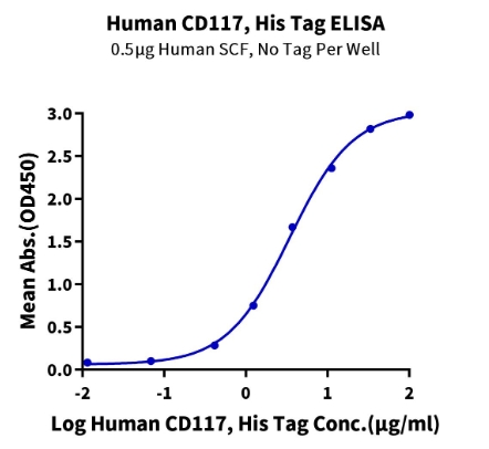 | Bio-activity : | Immobilized Human SCF at 5μg/ml (100μl/well) on the plate. Dose response curve for Human CD117, His Tag with the EC50 of 3.42μg/ml determined by ELISA. |