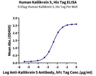 | Bio-activity : | Immobilized Human Kallikrein 5, His Tag at 0.5μg/ml (100μl/Well) on the plate. Dose response curve for Anti-Kallikrein 5 Antibody, hFc Tag with the EC50 of 3.7ng/ml determined by ELISA. |