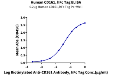 | Bio-activity : | Immobilized Human CD161, hFc Tag at 2ug/ml (100ul/Well) on the plate. Dose response curve for Biotinylated Anti-CD161 Antibody, hFc Tag with the EC50 of 40.7ng/ml determined by ELISA. |
