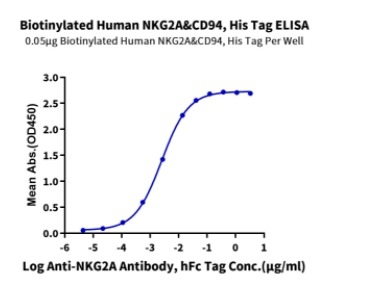 | Bio-activity : | Immobilized Biotinylated Human NKG2A&CD94, His Tag at 0.5μg/ml (100μl/Well) on streptavidin (5μg/ml) precoated plate. Dose response curve for Anti-NKG2A Antibody, hFc Tag with the EC50 of 2.5ng/ml determined by ELISA. |