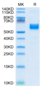Molecular Mass : | The protein has a predicted MW of 41.1 kDa. Due to glycosylation, the protein migrates to 55-70 kDa based on Tris-Bis PAGE result. |