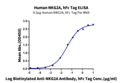 | Bio-activity : | Immobilized Human NKG2A, hFc Tag at 2μg/ml (100μl/Well) on Fc Antibody (2μg/ml) precoated plate. Dose response curve for Biotinylated Anti-NKG2A Antibody, hFc Tag with the EC50 of 37.1ng/ml determined by ELISA. |