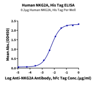 | Bio-activity : | Immobilized Human NKG2A, His Tag at 2ug/ml (100ul/Well) on the plate. Dose response curve for Anti-NKG2A Antibody, hFc Tag with the EC50 of 5.8ng/ml determined by ELISA. |