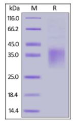 Molecular Mass : | The protein has a calculated MW of 17.9 kDa. The protein migrates as 30-40 kDa under reducing (R) condition (SDS-PAGE) due to glycosylation. |