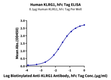 | Bio-activity : | Immobilized Human KLRG1, hFc Tag at 1ug/ml (100ul/Well) on the plate. Dose response curve for Biotinylated Anti-KLRG1 Antibody, hFc Tag with the EC50 of 24.9ng/ml determined by ELISA. |