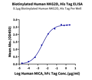 | Bio-activity : | Immobilized Biotinylated Human NKG2D, His Tag at 1ug/ml (100ul/well) on the streptavidin precoated plate (5ug/ml). Dose response curve for Human MICA, hFc Tag with the EC50 of 2.9ng/ml determined by ELISA. |