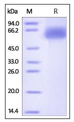 | Molecular Mass : | The protein has a calculated MW of 46.6 kDa. The protein migrates as 50-68 kDa under reducing (R) condition (SDS-PAGE) due to glycosylation. |