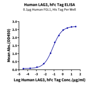 | Bio-activity : | Immobilized Human FGL1, His Tag at 1μg/ml (100μl/well) on the plate. Dose response curve for Human LAG3, hFc Tag with the EC50 of 75.1ng/ml determined by ELISA. |