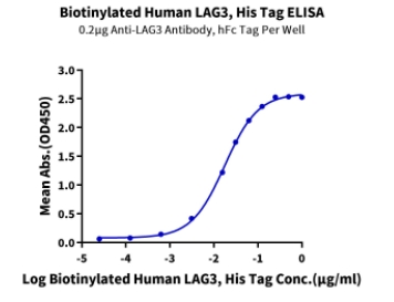 | Bio-activity : | Immobilized Anti-LAG3 Antibody, hFc Tag at 2ug/ml (100ul/well) on the plate. Dose response curve for Biotinylated Human LAG3, His Tag with the EC50 of 17.6ng/ml determined by ELISA (QC Test). |