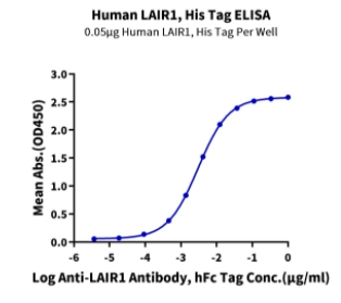 Immobilized Human LAIR1, His Tag at 0.5μg/ml (100μl/well) on the plate. Dose response curve for Anti-LAIR1 Antibody, hFc Tag with the EC50 of 3.0ng/ml determined by ELISA. |