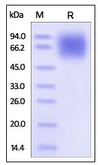 | Molecular Mass : | The protein has a calculated MW of 39.2 kDa. The protein migrates as 60-100 kDa under reducing (R) condition (SDS-PAGE) due to different glycosylation. |