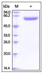 | Molecular Mass : | The protein has a calculated MW of 52.8 kDa. The protein migrates as 62 kDa under reducing (R) condition (SDS-PAGE) due to glycosylation. |