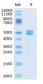 | Molecular Mass : | The protein has a predicted MW of 41.9 kDa. Due to glycosylation, the protein migrates to 48-55 kDa based on Tris-Bis PAGE result. |
