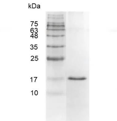 | Molecular Mass : | The protein has a calculated MW of 16.9 kDa. The protein migrates as 17 kDa under reducing condition (SDS-PAGE analysis). |