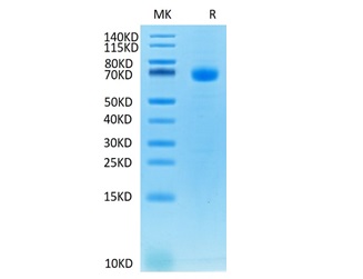 Molecular Mass : | The protein has a predicted MW of 49.5 kDa .Due to glycosylation, the protein migrates to 60-75 KDa based on Bis-Tris PAGE result. |