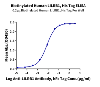 | Bio-activity : | Immobilized Biotinylated Human LILRB1, His Tag at 2ug/ml (100ul/well) on the streptavidin precoated plate (5ug/ml). Dose response curve for Anti-LILRB1 Antibody, hFc Tag with the EC50 of 7.5ng/ml determined by ELISA. |