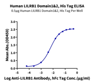 | Bio-activity : | Immobilized Human LILRB1 Domain1&2, His Tag at 5μg/ml (100μl/Well) on the plate. Dose response curve for Anti-LILRB1 Antibody, hFc Tag with the EC50 of 6.1ng/ml determined by ELISA. |