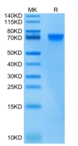 Molecular Mass : | The protein has a predicted MW of 50.2 kDa. Due to glycosylation, the protein migrates to 70-75 kDa based on Tris-Bis PAGE result. |