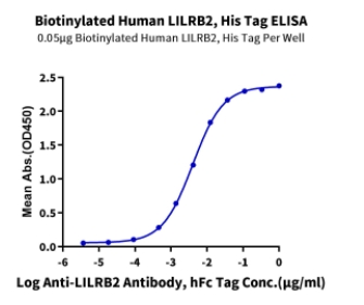 | Bio-activity : | Immobilized Biotinylated Human LILRB2, His Tag at 0.5ug/ml (100ul/Well) on streptavidin (5ug/ml) precoated plate. Dose response curve for Anti-LILRB2 Antibody, hFc Tag with the EC50 of 4.0ng/ml determined by ELISA. |