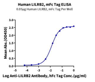 | Bio-activity : | Immobilized Human LILRB2, mFc Tag at 0.5ug/ml (100ul/well) on the plate. Dose response curve for Anti-LILRB2 Antibody, hFc Tag with the EC50 of 13.0ng/ml determined by ELISA (QC Test). |