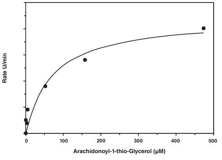 Unit Definition : | One unit is defined as the amount of enzyme required to produce 1 nmol of thioglycerol from arachidonoyl-1-thio-glycerol per minute at 37 centigrade in 10 mM Tris-HCl, pH 8.0, containing 1 mM EDTA. |