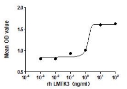 Mechanism: Lemur tyrosine kinase 3 (LMTK3), a member of the receptor tyrosine kinase (RTK) family, is implicated in breast cancer growth and endocrine resistance.It has been reported that LMTK3 promotes cell invasion, motility, and migration of the MCF-7 breast cancer cell line . To test the bioactivity of LMTK3 ,MCF-7 cells were seeded into triplicate wells of 96-well plates at a density of 2,000 cells/well in serum-free standard DMEM after adding to various concentrations of LMTK3 protein. After incubated for 72h, cells were observed by inverted microscope and cell proliferation was measured by Cell Counting Kit-8(CCK-8). Briefly,10 µl of CCK-8 solution was added to each well of the plate,then measure the absorbance at 450 nm using a microplate reader after incubating the plate for 1-4 hours at 37 °C. Cell proliferation of MCF-7 cells after incubation with LMTK3 for 72h observed by inverted microscope was shown.Cell proliferation of MCF-7 cells after incubation with LMTK3 for 72h observed by inverted microscope was shown. |