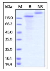 | Molecular Mass : | The protein has a calculated MW of 111.6 kDa. As a result of Glycosylation, the protein migrates as 120-130 kDa under reducing (R) condition, and 200-240 kDa under non-reducing (NR) condition (SDS-PAGE). |
