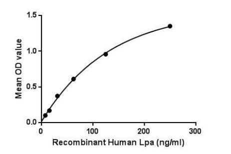 Lipoprotein, a (Lpa) is a lipoprotein subclass. Lpa is assembled at the hepatocyte cell membrane surface, while other scenarios exist with regard to the location of assembly. It mainly exists in plasma. Lpa contributes to the process of atherogenesis. It also may enhance coagulation by inhibiting the function of tissue factor pathway inhibitor. Lpa carries cholesterol and binds atherogenic proinflammatory oxidized phospholipids as a preferential carrier of oxidized phospholipids in human plasma, which attract inflammatory cells to vessel walls and leads to smooth muscle cell proliferation. Moreover, Lpa also is hypothesized to be involved in wound healing and tissue repair, interacting with components of the vascular wall and extra cellular matrix. Besides, Fibronectin (FN) has been identified as an interactor of Lpa, thus a binding ELISA assay was conducted to detect the interaction of recombinant human Lpa and recombinant human FN. Briefly, Lpa were diluted serially in PBS, with 0.01% BSA (pH 7.4). Duplicate samples of 100μL were then transferred to FN-coated microtiter wells and incubated for 2h at 37°C. Wells were washed with PBST and incubated for 1h with anti-Lpa pAb, then aspirated and washed 3 times. After incubation with HRP labelled secondary antibody, wells were aspirated and washed 3 times. With the addition of substrate solution, wells were incubated 15-25 minutes at 37°C. Finally, add 50μL stop solution to the wells and read at 450nm immediately. The binding activity of Lpa and FN was shown in Figure, and this effect was in a dose dependent manner. |