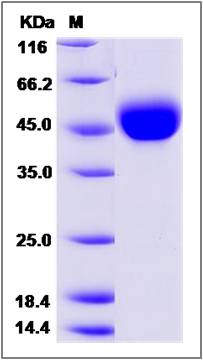 Molecular Mass : | The recombinant human LRG1 comprises 323 amino acids and has a predicted molecular mass of 35.8 kDa. The apparent molecular mass of the protein is approximately 44-48 kDa in SDS-PAGE under reducing conditions. |