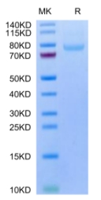 | Molecular Mass : | The protein has a predicted MW of 60.7 kDa. Due to glycosylation, the protein migrates to 70-80 kDa based on Tris-Bis PAGE result. |