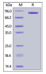 | Molecular Mass : | The protein has a calculated MW of 92.4 kDa. The protein migrates as 106 KDa under reducing (R) condition (SDS-PAGE) due to glycosylation. |