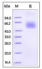 | Molecular Mass : | The protein has a calculated MW of 37.5 kDa. The protein migrates as 50-65 kDa under reducing (R) condition (SDS-PAGE) due to glycosylation. |