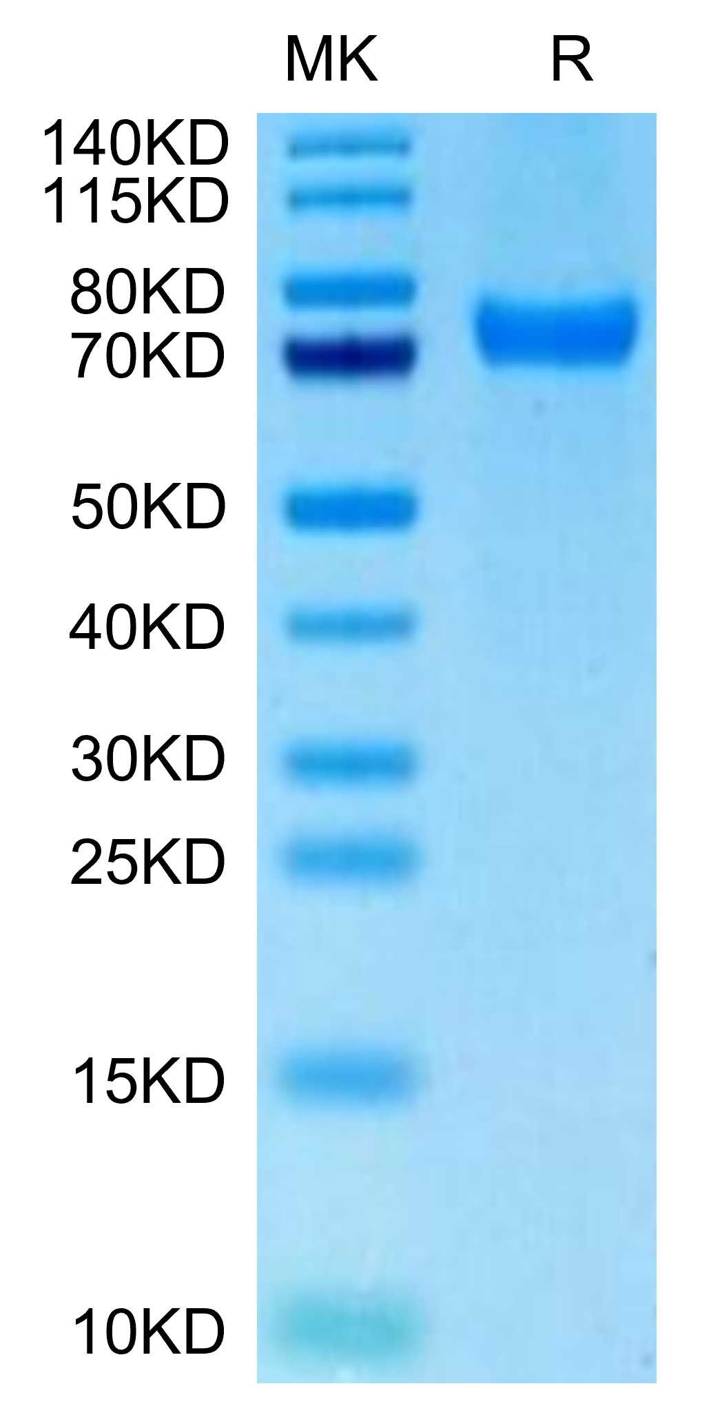 | Molecular Mass : | The protein has a predicted MW of 47.7 kDa. Due to glycosylation, the protein migrates to 70-80 kDa based on Tris-Bis PAGE result. |