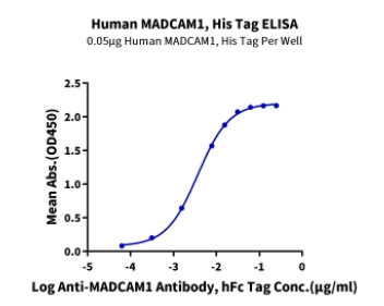 | Bio-activity : | Immobilized Human MADCAM1, His Tag at 0.5ug/ml (100ul/Well) on the plate. Dose response curve for Anti-MADCAM1 Antibody, hFc Tag with the EC50 of 3.7ng/ml determined by ELISA. |