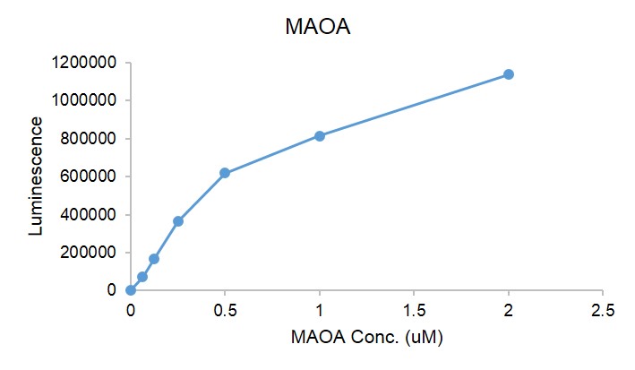 | Applications : | Recombinant MAOA is suitable for use in the study of enzyme kinetics, inhibitor screening, and selectivity profiling. Monoamine Oxidase Assay: 40 μM substrate was incubated with MAOA protein in reaction buffer for 1 hour at room temperature, then the product was incubated with Detection Reagent for 0.5 hour at temperature. The activity of MAOA was detected by Promega MAO-Glo Assay. |