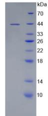 43kDa as determined by SDS-PAGE reducing conditions. |