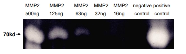 | Bio-activity : | MMP2 is a zinc-dependent enzymes capable of cleaving components of the extracellular matrix, which belongs to the matrix metalloproteinase (MMP) family. It is a gelatinase A, 72kDa type IV collagenase which can hydrolyze gelatin under certain conditions. Gelatin zymography is mainly used for the detection of the gelatinases, MMP-2 and MMP-9 and It is extremely sensitive because levels of 10pg of MMP-2 can already be detected. Briefly, various concentrations of MMP2 (500ng, 125ng, 63ng, 32ng, 16ng) were denatured by SDS loading buffer, electrophoresed through sodium dodecylsulphate-polyacrylamide gel (SDS-PAGE; 10% gels) containing gelatin (1mg/mL) with nonreducing conditions. After renaturation, incubation and CCB-stained, active MMP2 would hydrolyze gelatin nearby, which was indicated by the white binds on the gel. In this experiment we use heat-denatured MMP2 protein as negative control, and blood sample as positive control. |