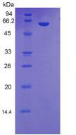 63kDa as determined by SDS-PAGE reducing conditions. |