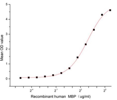 | Bio-activity : | Myelin basic protein (MBP), a 18.5-kDa encephalitogenic peptide, is the second most abundant in central nervous system and responsible for adhesion of the cytosolic surfaces of multilayered compact myelin, MBP is biased expressed in cerebellum adult and cortex adult. It can interact with a number of polyanionic proteins including actin, tubulin, Ca(2 )-calmodulin, and clathrin, and negatively charged lipids, and acquires structure on binding to them. Calmodulin Like Protein 3 (CALML3) is a kind of Ca(2 )-calmodulin, thus a functional binding ELISA assay was conducted to detect the interaction of recombinant human MBP and recombinant human CALML3. Briefly, biotin-linked MBP were diluted serially in PBS, with 0.01% BSA (pH 7.4). Duplicate samples of 100 ul were then transferred to CALML3-coated microtiter wells and incubated for 1h at 37°C. Wells were washed with PBST 3 times and incubation with Streptavidin-HRP for 30min, then wells were aspirated and washed 5 times. With the addition of substrate solution, wells were incubated 15-25 minutes at 37°C. Finally, add 50 µl stop solution to the wells and read at 450 nm immediately. The binding activity of recombinan human MBP and recombinan human CALML3 was shown, the EC50 for this effect is 7.4 ug/mL. |
