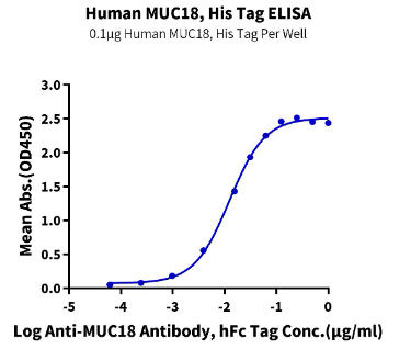 | Bio-activity : | Immobilized Human MUC18, His Tag at 1μg/ml (100μl/well) on the plate. Dose response curve for Anti-MUC18 Antibody, hFc Tag with the EC50 of 12.5ng/ml determined by ELISA. |