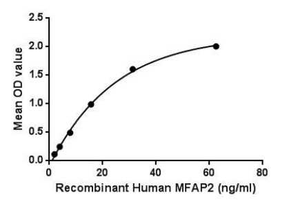 | Bio-activity : | Microfibrillar-associated protein 2 (MFAP2) is an O-glycosylated protein which excreted to the extracellular space and the extracellular matrix. MFAP2 combine biglycan and elastin to form a ternary complex. MFAP2 plays a key role in the support and distensibility of the juxtacanalicular region of these collector channels. It also can inhibit LTB-1 binding to fibrillin-1, stimulate the phosphorylation of Smad2, and thereby mediate the subsequent extracellular deposition of latent TGFbeta. Besides, Fibrillin 1 (FBN1) has been identified as an interactor of MFAP2, thus a binding ELISA assay was conducted to detect the interaction of recombinant human MFAP2 and recombinant human FBN1. Briefly, MFAP2 were diluted serially in PBS, with 0.01% BSA (pH 7.4). Duplicate samples of 100uL were then transferred to FBN1-coated microtiter wells and incubated for 2h at 37°C. Wells were washed with PBST and incubated for 1h with anti-MFAP2 pAb, then aspirated and washed 3 times. After incubation with HRP labelled secondary antibody, wells were aspirated and washed 3 times. With the addition of substrate solution, wells were incubated 15-25 minutes at 37°C. Finally, add 50µL stop solution to the wells and read at 450nm immediately. The binding activity of MFAP2 and FBN1 was shown in Figure, and this effect was in a dose dependent manner. |