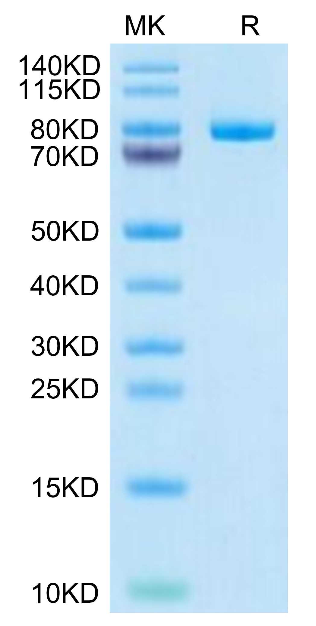 | Molecular Mass : | The protein has a predicted MW of 76.60 kDa. Due to glycosylation, the protein migrates to 78-88 kDa based on Tris-Bis PAGE result. |