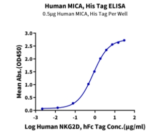 | Bio-activity : | Immobilized Human MICA, His Tag at 5μg/ml (100μl/Well) on the plate. Dose response curve for Human NKG2D, hFc Tag with the EC50 of 0.81μg/ml determined by ELISA. |