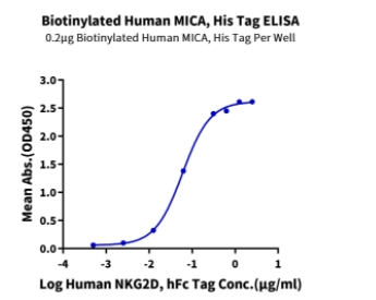 | Bio-activity : | Immobilized Biotinylated Human MICA, His Tag at 2ug/ml (100ul/well) on the streptavidin precoated plate (5ug/ml). Dose response curve for Human NKG2D, hFc Tag with the EC50 of 59.7ng/ml determined by ELISA. |