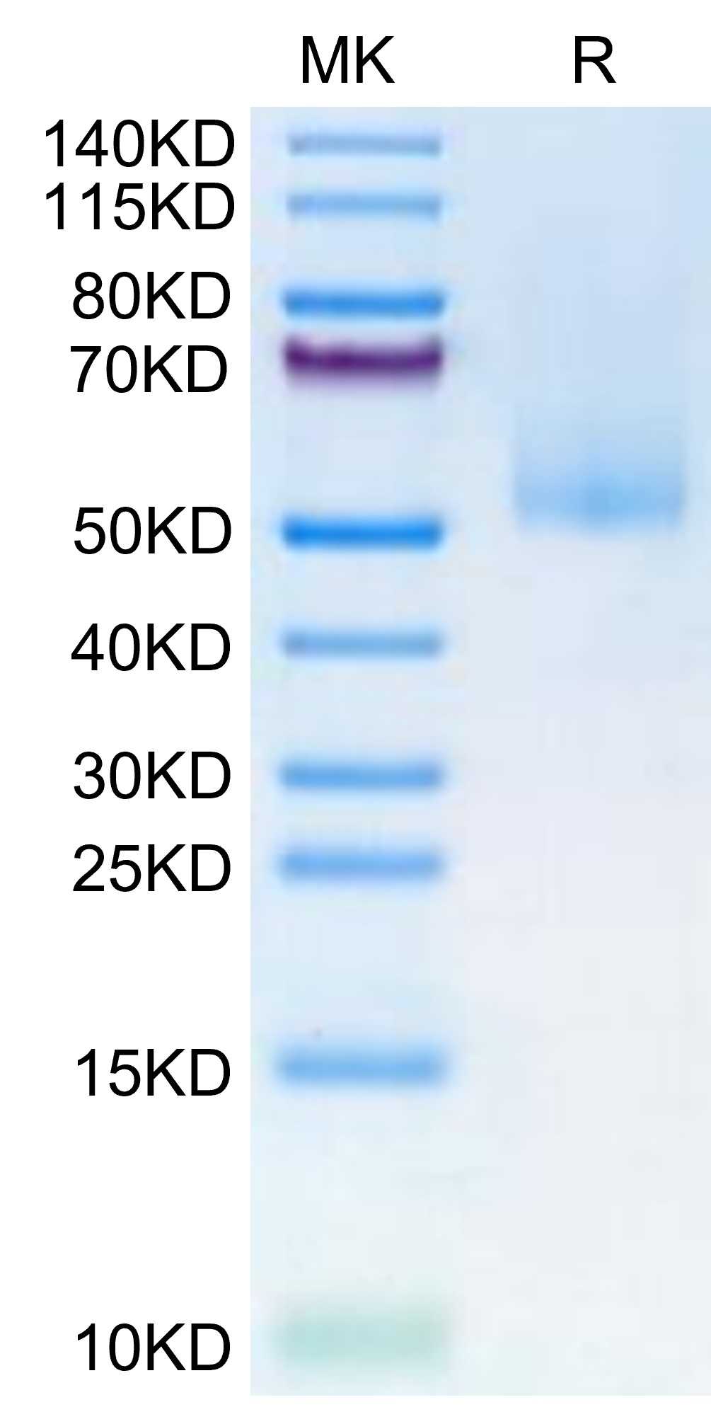 | Molecular Mass : | The protein has a predicted MW of 36.8 kDa. Due to glycosylation, the protein migrates to 50-65 kDa based on Tris-Bis PAGE result. |