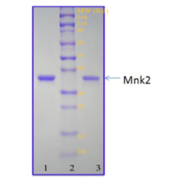 MNK2 D228G, 2 mM DTT, 20% glycerol, 0.02% NaN3, 0.1 mM EDTA, 150 mM NaCl , 50 mM Tris-HCl pH7.5. |