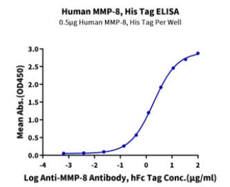 | Bio-activity : | Immobilized Human MMP-8, His Tag at 5μg/ml (100μl/well) on the plate. Dose response curve for Anti-MMP-8 Antibody, hFc Tag with the EC50 of 1.93μg/ml determined by ELISA (QC Test). |