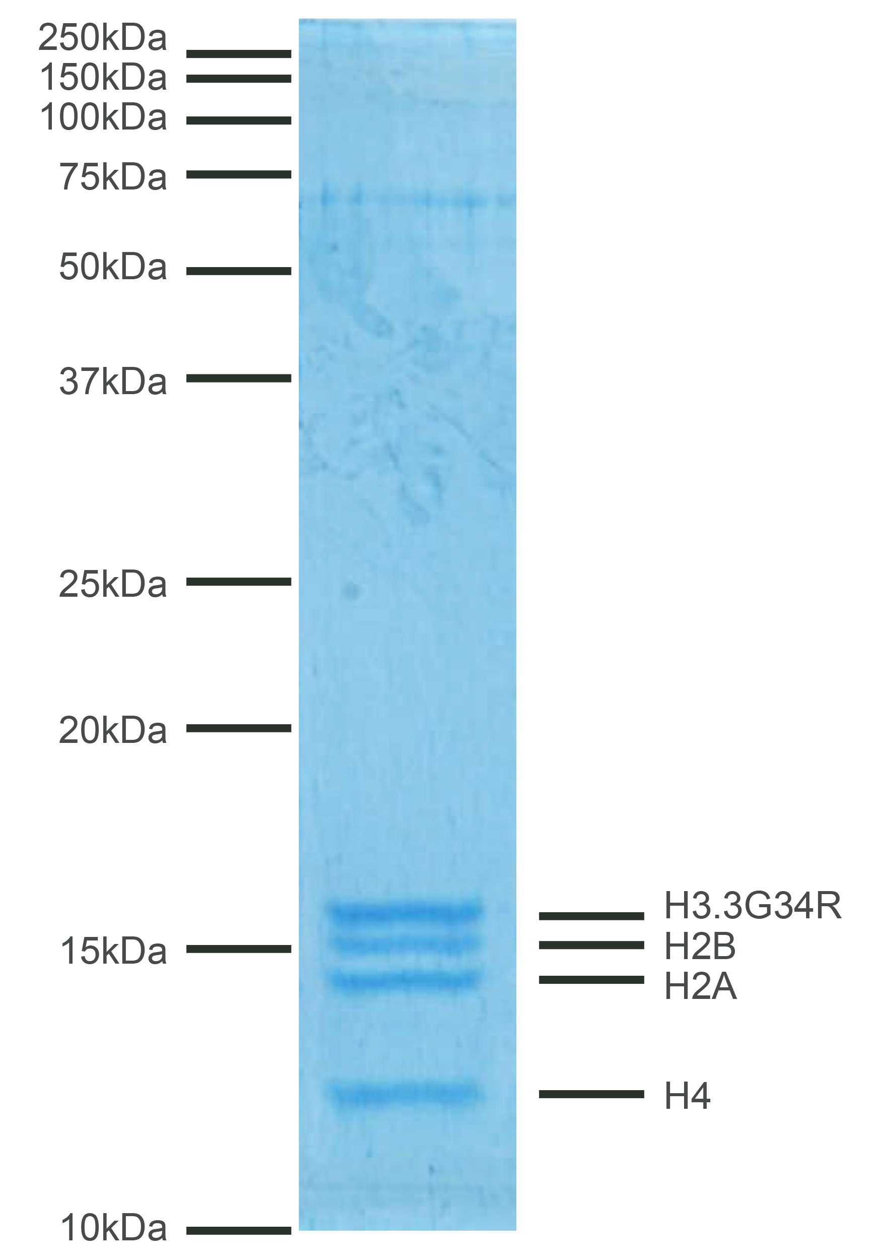 | Applications : | Mononucleosomes (H3.3G34R), Recombinant Human are highly purified and are suitable for use as substrates in enzyme screening assays or for nucleosome binding experiments. The absence of post-translational histone modifications makes them ideal for conducting enzyme activity and screening assays. Mononucleosomes (H3.3G34R), Recombinant Human do not contain free DNA which could alter assayed activities. |