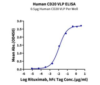 | Bio-activity : | Immobilized Human CD20 VLP at 5ug/ml (100ul/Well) on plate on the plate. Dose response curve for Rituximab, hFc Tag with the EC50 of 11.4ng/ml determined by ELISA (QC Test). |