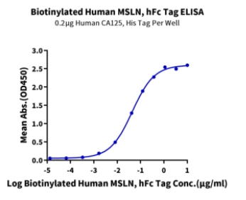 Immobilized Human CA125, His Tag at 2ug/ml (100ul/well) on the plate. Dose response curve for Biotinylated Human MSLN, hFc Tag with the EC50 of 44.1ng/ml determined by ELISA. |